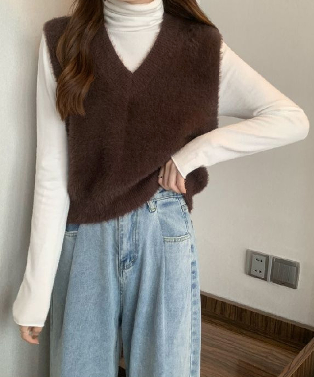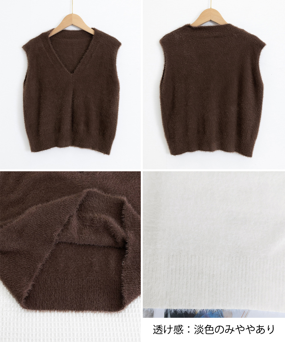 レディース フェイクファーニットベスト Vネック ノースリーブニットトップス 大人可愛い重ね着ニット無地 韓国風春秋冬服 レイヤードニット女 セーターベスト起毛 ふわふわニットソー Vネックデザインが大人っぽい印象を与える、フェイクミンクニットベスト。 柔らかな質感とすっきりとしたシルエットで軽やかに着こなせ、シンプルながらも上品な雰囲気を演出。 シャツやカットソーに重ねるだけでこなれ感のあるレイヤードスタイルが完成し、デイリーにもお出かけにもぴったり。 素材:ポリエステル75%+アクリル25% カラー:ブラック/ホワイト/アイボリー/ブラウン/ワインレッド サイズ:ワンサイズ 着丈:約47cm 肩幅:約39cm 身幅:約47cm 胸囲:約94-130cm 裏地:なし 伸縮性:あり 透け感:淡色のみややあり 生産国:中国 ※すべて平置きサイズです(採寸方法違いより、多少の誤差がございますので、ご了承ください)。 ※海外輸入品のため、商品の細部仕様は多少異なる場合がございます。予めご了承の上、ご注文お願い致します。