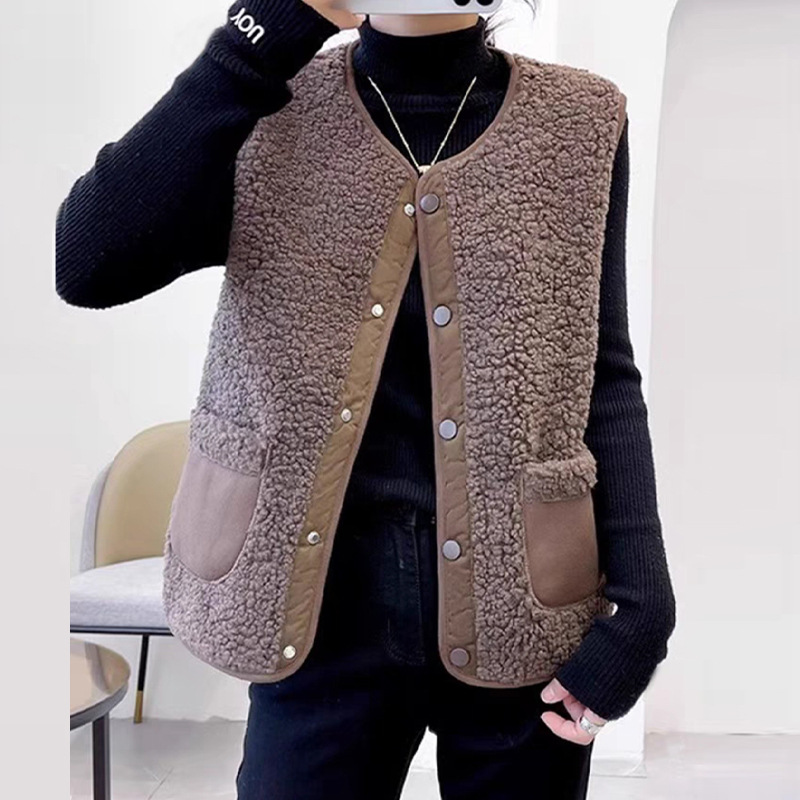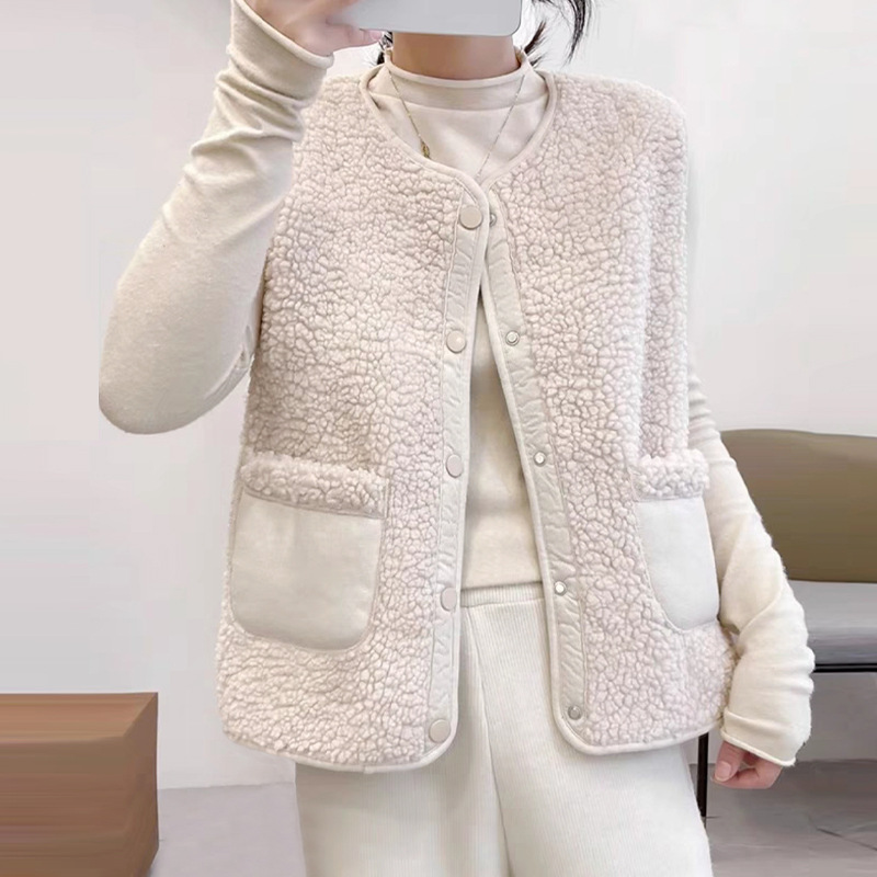 ふんわりとした肌触りが心地よいフリース素材のレディースベストです。 ボア素材と滑らかな生地の切替デザインがおしゃれで、大きめのポケットが実用的なアクセントになっています。 スナップボタンで着脱も簡単、軽やかな着心地で重ね着にも最適です。 カジュアルからきれいめまで幅広いスタイルに合わせやすく、秋冬の装いに温かさと可愛らしさをプラスしてくれる一枚です。