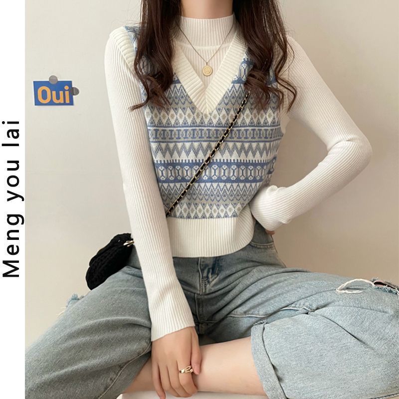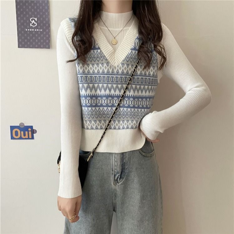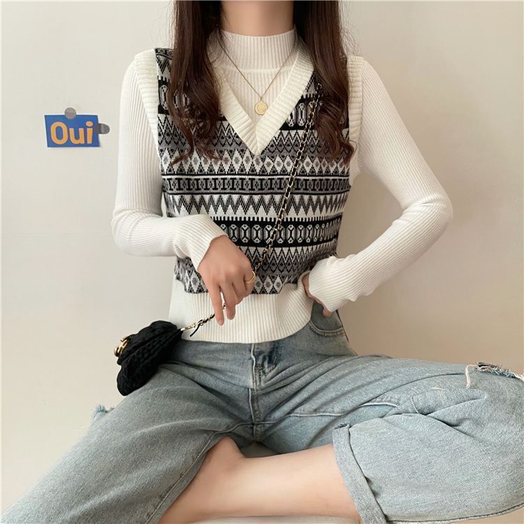 トレンド感のある幾何学模様が目を引くレディースベストです。 ブイネックのデザインが女性らしい印象を与え、リブ編みのインナーと重ね着することで洗練されたレイヤードスタイルが完成します。 ニット素材で程よい厚みがあり、秋冬のコーディネートに大活躍するアイテムです。 カジュアルにもきれいめにも着こなせる万能なベストで、デニムやスカートとの相性も抜群です。