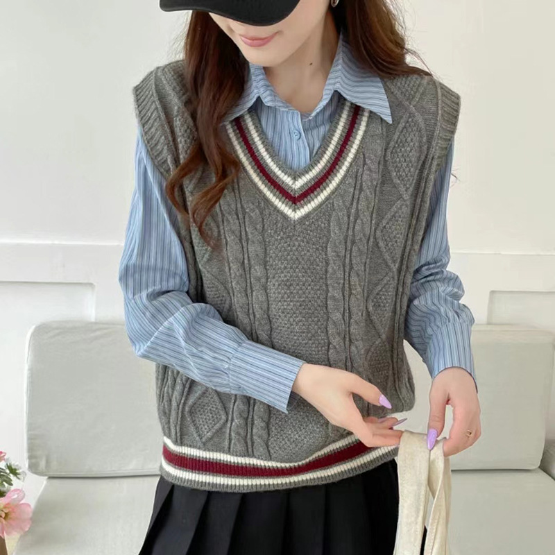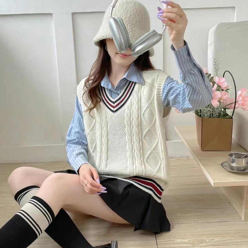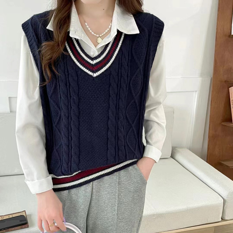 学生風のスタイルを演出できるレディースベストです。 ケーブル編みの立体的な編み模様が上品さを引き立てます。 襟元と裾にあしらわれたトリコロールのラインがアクセントとなり、カジュアルな中にも洗練された印象を与えます。 シャツやブラウスと合わせてレイヤードスタイルを楽しめるニットアイテムです。 程よいゆとりのあるシルエットで、幅広いコーディネートに活躍します。