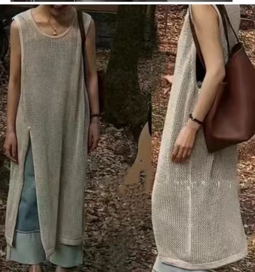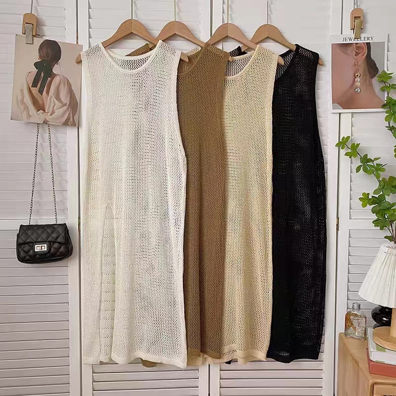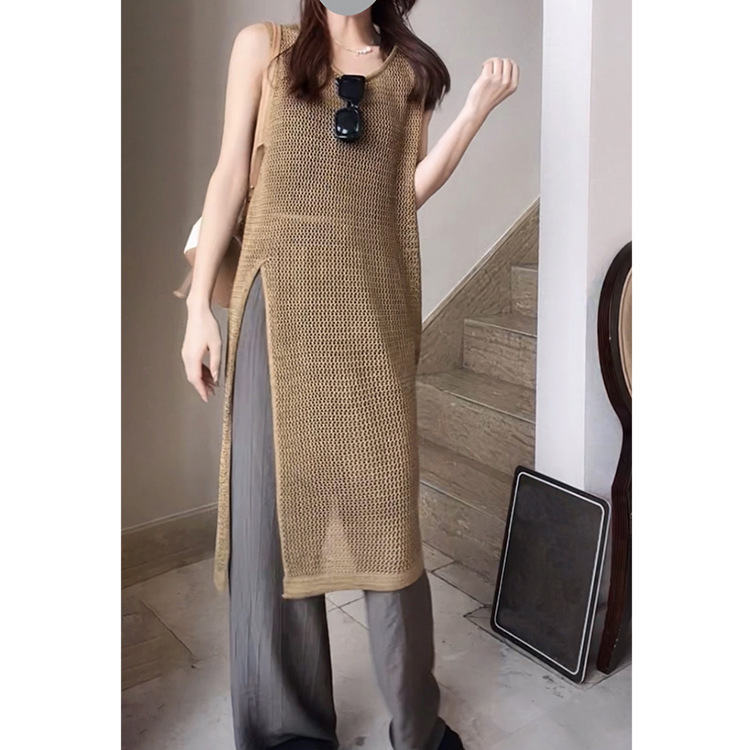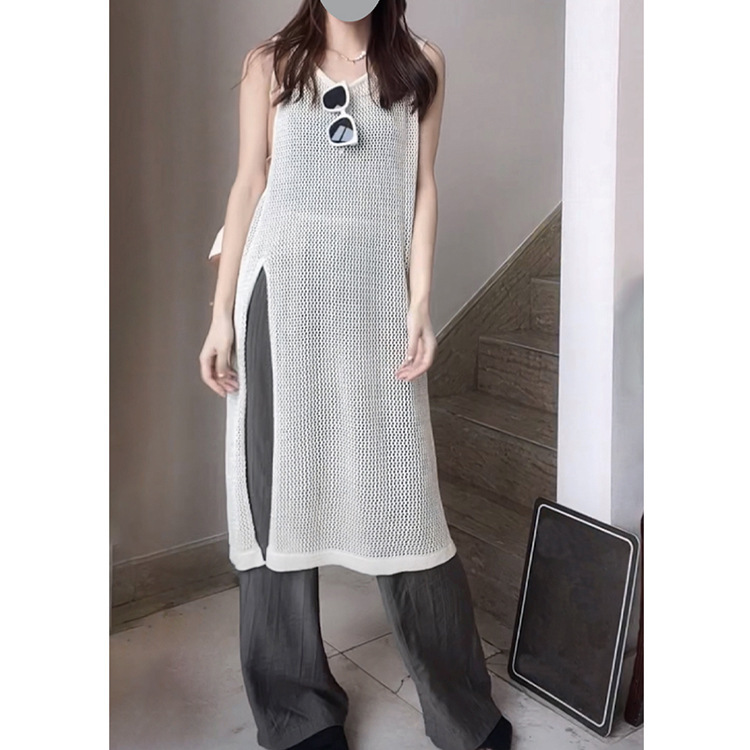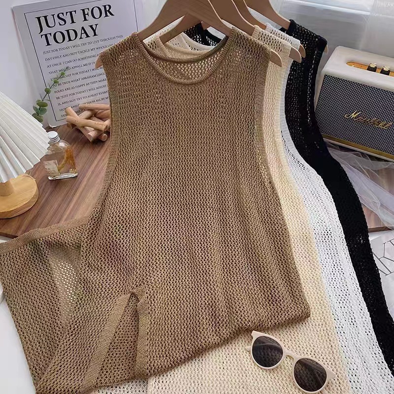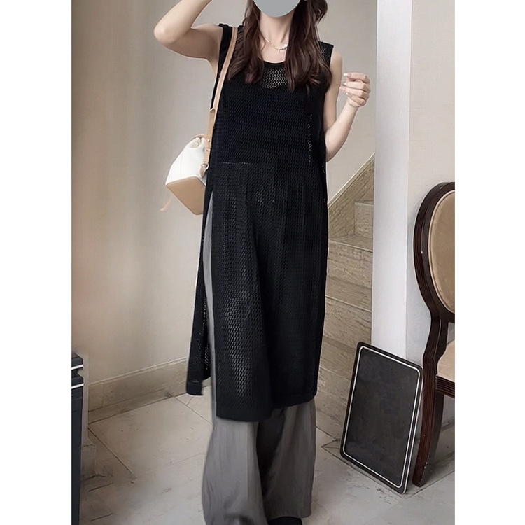 春夏にぴったりな透かし編みニットベストは今季注目のレディースベストアイテム。 ロング丈とサイドスリットで縦ラインを美しく演出します。 日常のお出かけから重ね着まで着回ししやすい万能アイテムです。