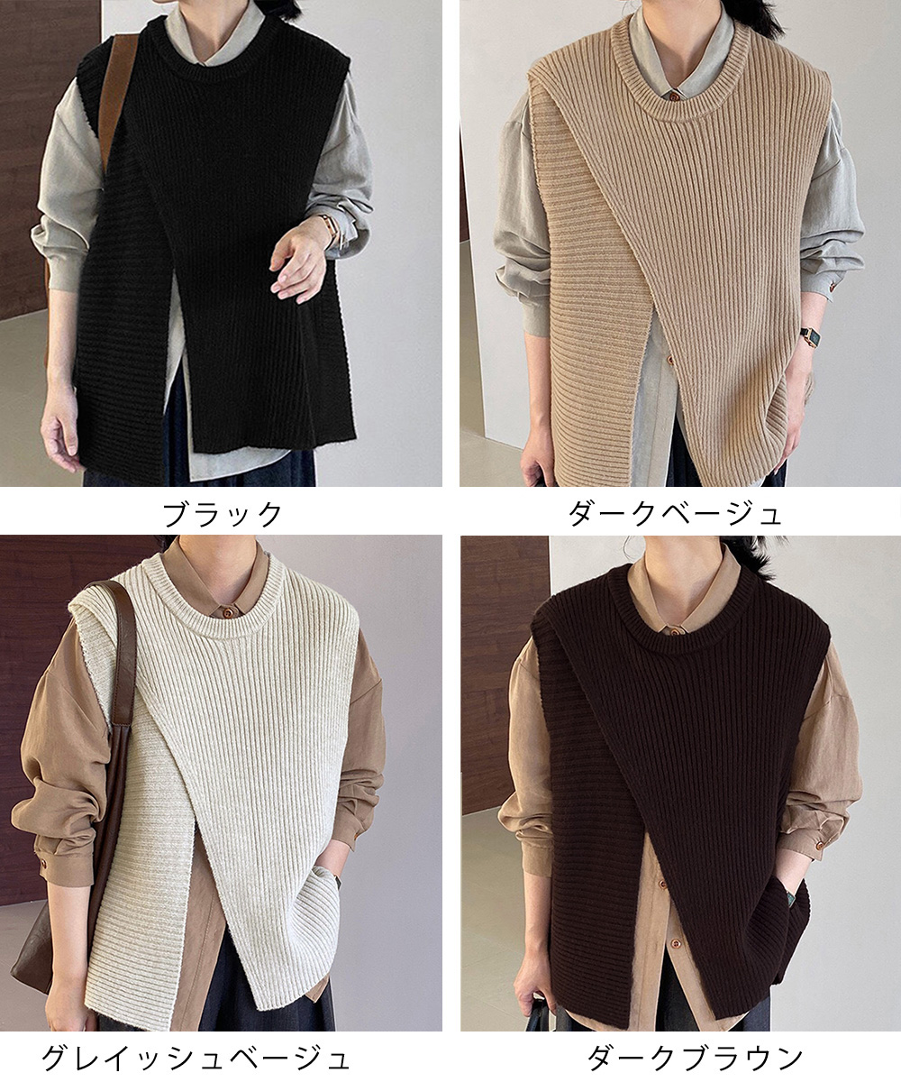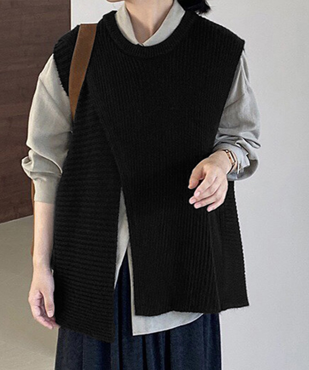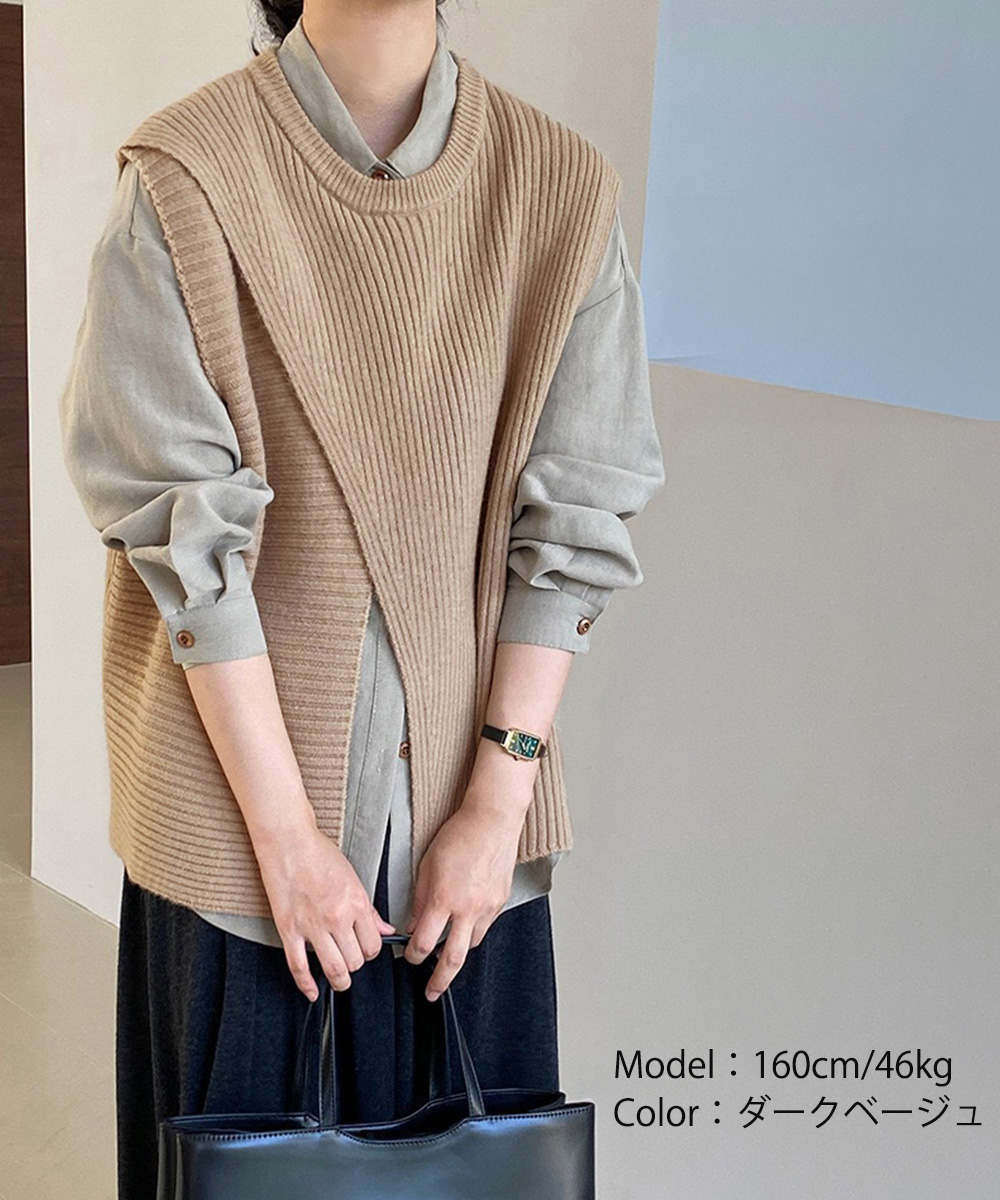 前後スリット入りのデザインがおしゃれな印象を与える、秋冬新作のレディースベスト。 リブ編みの立体感とゆったりシルエットで抜け感を演出し、レイヤードスタイルに最適。 シャツやワンピースに重ねるだけで、通勤やお出かけの大人カジュアルコーデに活躍。